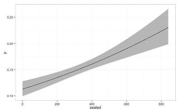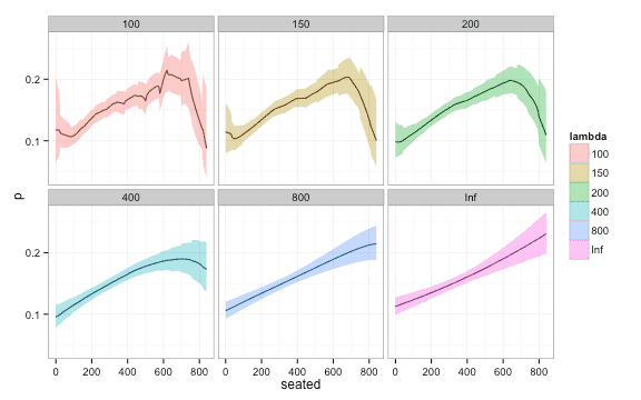 lambda = 10) ggplot(df, aes(y = p, x = seated, ymin = lwr, ymax = upr)) + geom_line() +